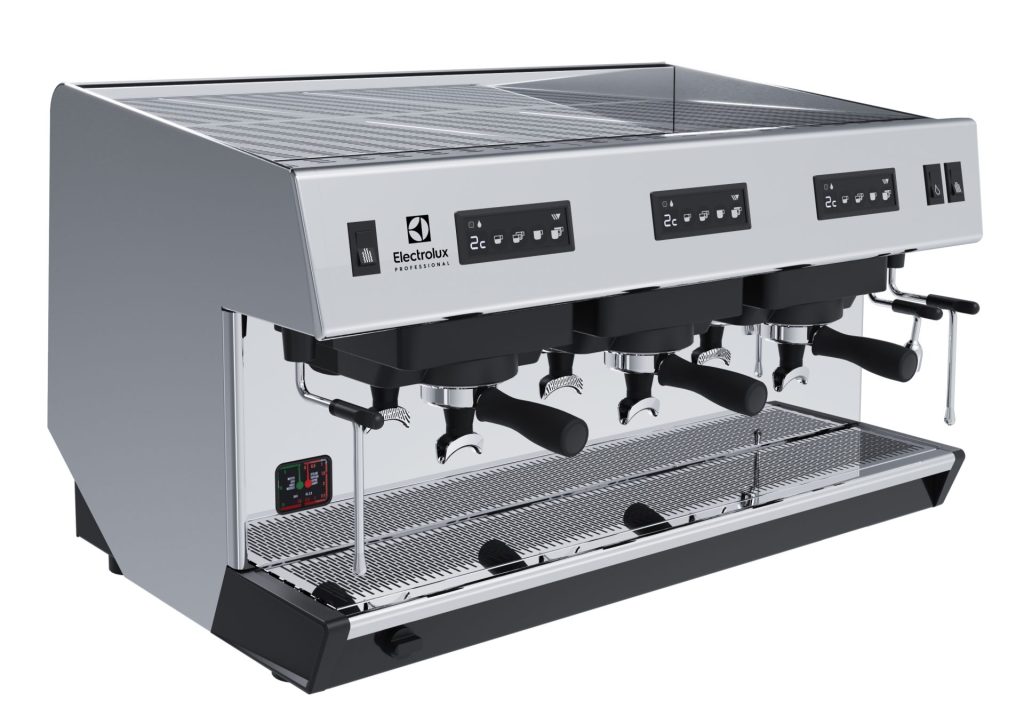 Macchina tradizionale per caffè espresso, 3 gruppi di erogazione, boiler da 15,6 litri, 3 blocchi di controllo indipendenti con 4 sezioni di dosaggio programmabili, acqua e vapore manuali, ciclo di pulizia automatico, corpo in acciaio inox. Portafiltri inclusi.