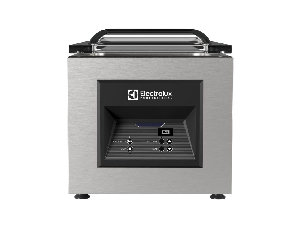 - Predisposta per il confezionamento sottovuoto esterno in contenitori collegando un apposito tubo alla bocchetta di estrazione aria (disponibile come ricambio).