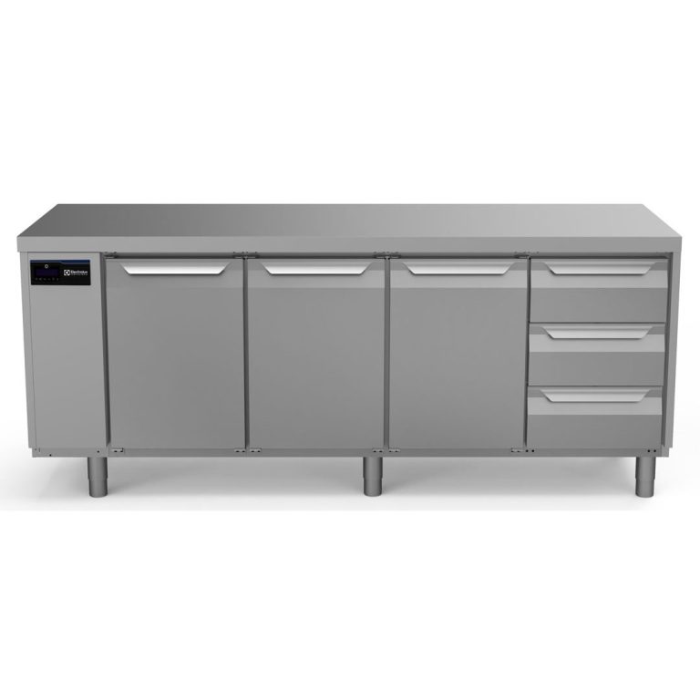 Tavolo refrigerato 590 litri, 3 porte e 3x1/3 cassetti, -2+10°C, AISI 304, remoto