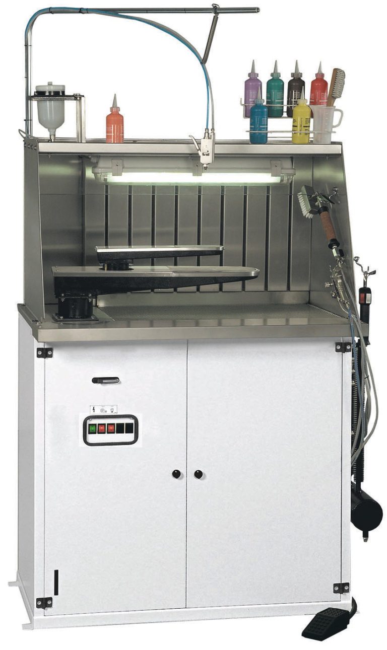 Cabina di smacchiatura. Pistola a freddo,pistola asciugante ad aria, gruppo smacchiante pivottante con piano aspirato.