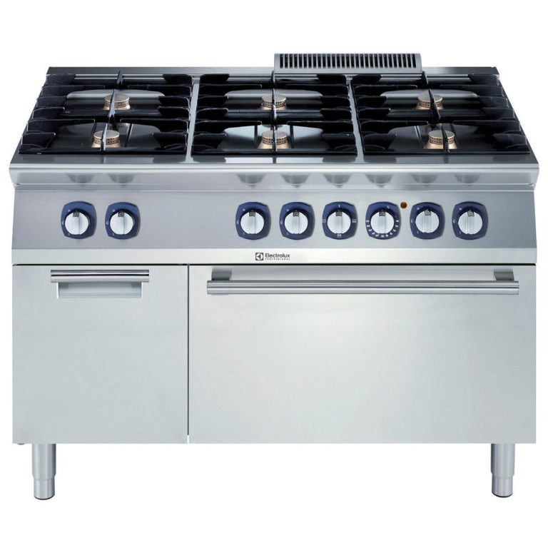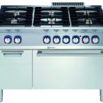 Cucina a gas 6 fuochi (6x5,5 kw) su forno elettrico statico (6 kw) e vano armadiato