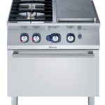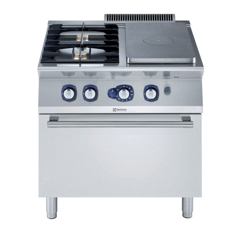 Tuttapiastra a gas (3,8 kw) ½ modulo combinato con 2 fuochi (2x5,5 kw) su forno a gas statico (6 kw)
