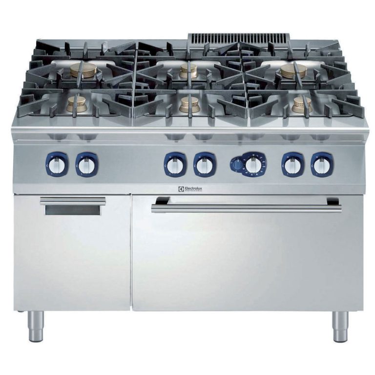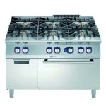Cucina a gas 6 fuochi (2x10kw+4x6kw) su forno a gas statico (8,5kw) e vano armadiato