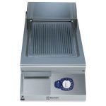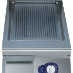 Fry top a gas con piastra rigata e inclinata, in acciaio al cromo spazzolato, 1/2 modulo, controllo termostatico. Raschietto incluso