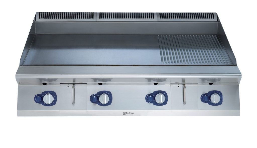 Fry top a gas HP con piastra larga 2/3 liscia e 1/3 rigata e orizzontale, in acciaio al cromo altamente resistente ai graffi, da 1200 mm, controllo termostatico. Raschietto incluso.