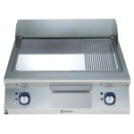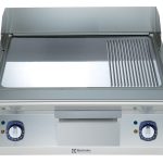 Fry top elettrico con piastra 2/3 liscia e 1/3 rigata e inclinata, in acciaio al cromo lucido, modulo intero, controllo termostatico. Raschietto incluso