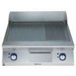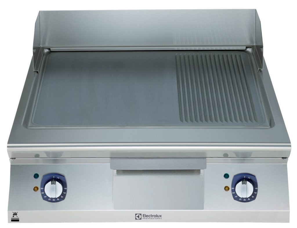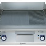 Fry top elettrico con piastra 2/3 liscia e 1/3 rigata e inclinata, in acciaio al cromo spazzolato, modulo intero, controllo termostatico. Raschietto incluso