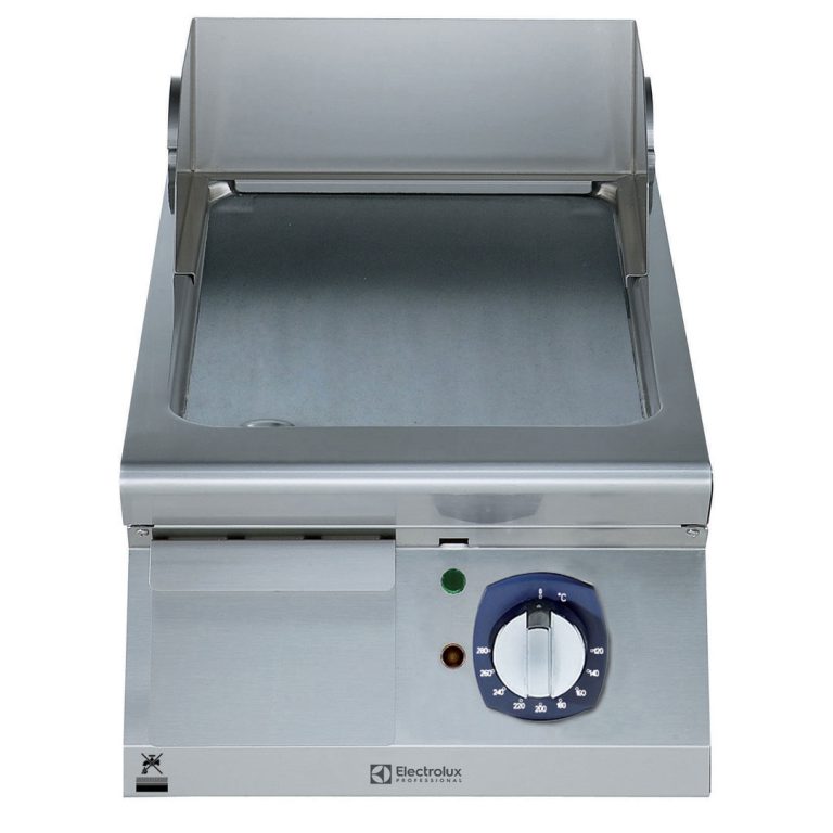 Fry top elettrico con piastra liscia e orizzontale, in acciaio al cromo spazzolato, 1/2 modulo, controllo termostatico. Raschietto e tappo inclusi