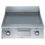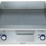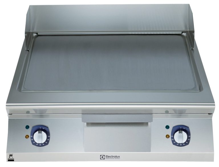 Fry top elettrico con piastra liscia e orizzontale, in acciaio al cromo spazzolato, modulo intero, controllo termostatico. Raschietto e tappo inclusi