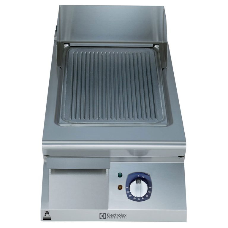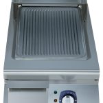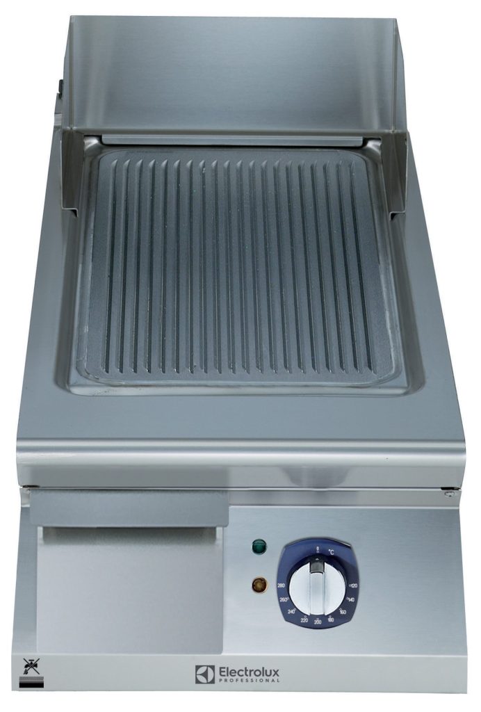 Fry top elettrico con piastra rigata e inclinata, in acciaio al cromo spazzolato, 1/2 modulo, controllo termostatico. Raschietto incluso