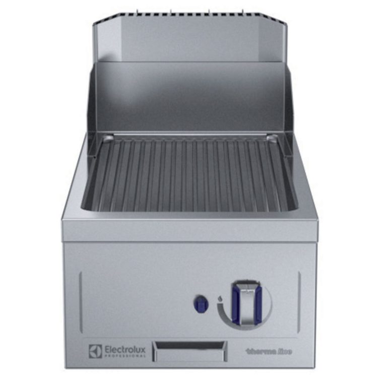 Fry top a gas con piastra rigata al cromo, ½ modulo, con alzatina posteriore - 1 lato operatore