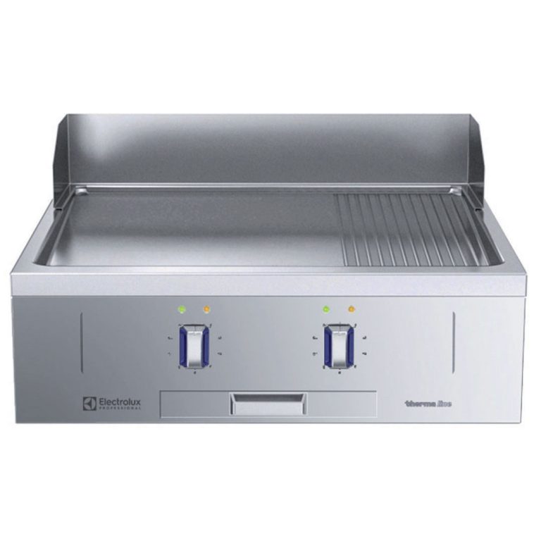 Fry top elettrico con piastra liscia/rigata al cromo, modulo intero, con alzatina posteriore - 1 lato operatore