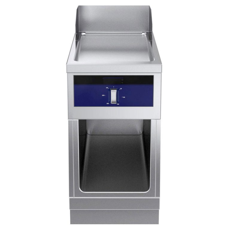 Fry top elettrico con piastra liscia al cromo su vano aperto, ½ modulo, con alzatina posteriore - 1 lato operatore