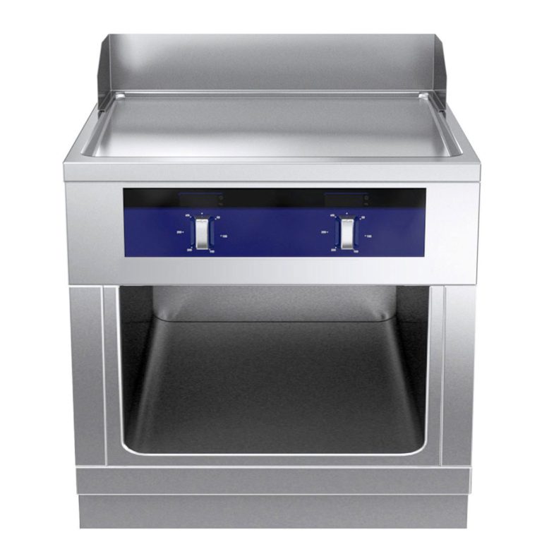 Fry top elettrico con piastra liscia al cromo su vano aperto, modulo intero, con alzatina posteriore - 1 lato operatore