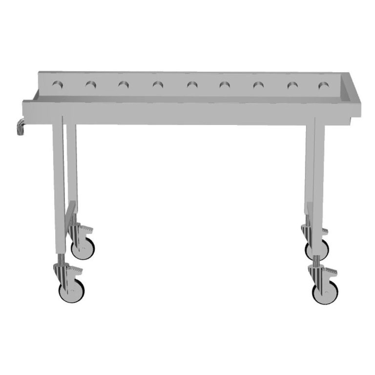 - Quattro gambe incluse con ruote girevoli con sistema semplificato di aggancio alla curva di uscita lavastoviglie per un veloce accesso. Due ruote dotate di freno per stabilizzare la posizione del nastro trasportatore durante il normale funzionamento