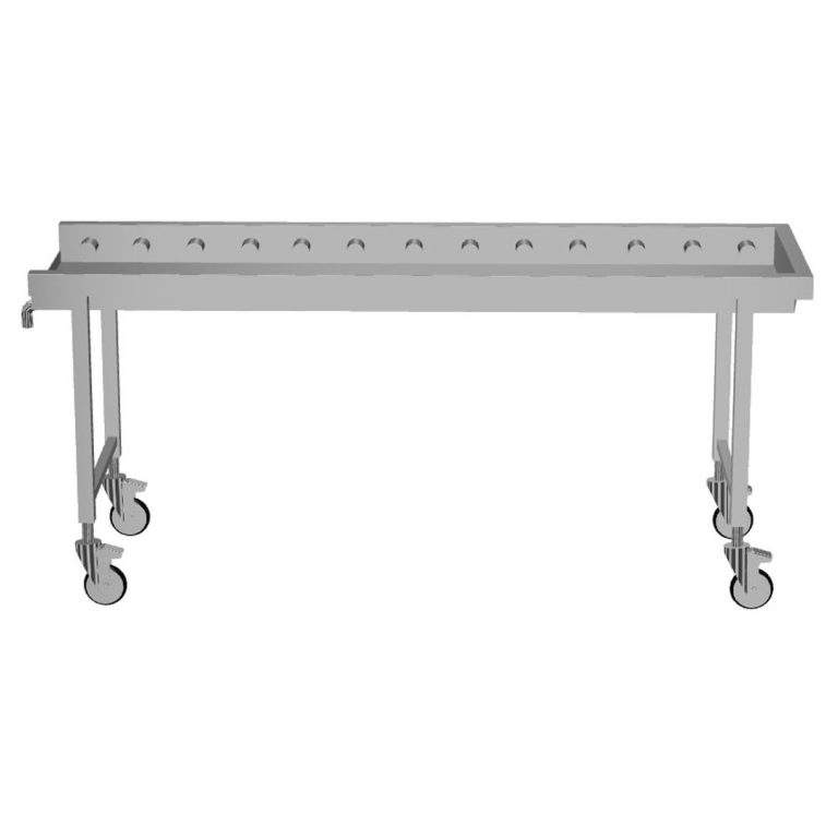 - Quattro gambe incluse con ruote girevoli con sistema semplificato di aggancio alla curva di uscita lavastoviglie per un veloce accesso. Due ruote dotate di freno per stabilizzare la posizione del nastro trasportatore durante il normale funzionamento