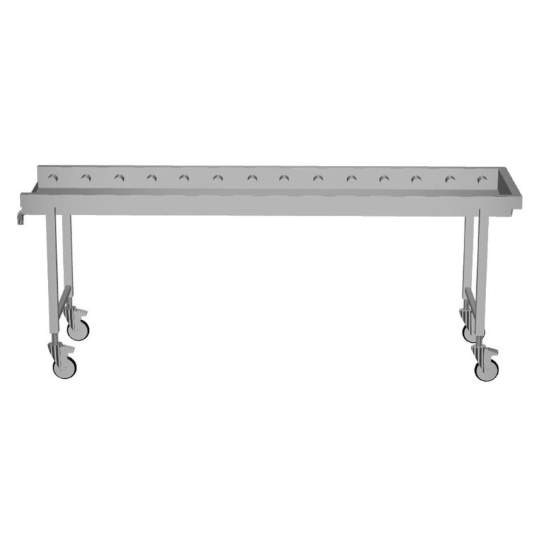 - Quattro gambe incluse con ruote girevoli con sistema semplificato di aggancio alla curva di uscita lavastoviglie per un veloce accesso. Due ruote dotate di freno per stabilizzare la posizione del nastro trasportatore durante il normale funzionamento