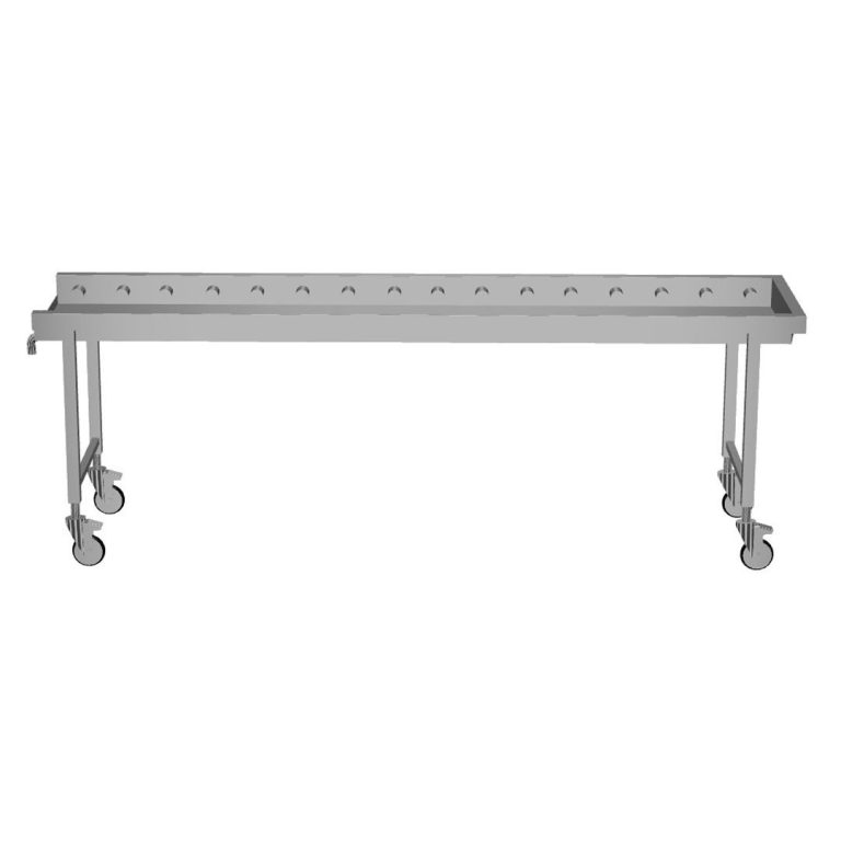 - Quattro gambe incluse con ruote girevoli con sistema semplificato di aggancio alla curva di uscita lavastoviglie per un veloce accesso. Due ruote dotate di freno per stabilizzare la posizione del nastro trasportatore durante il normale funzionamento