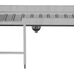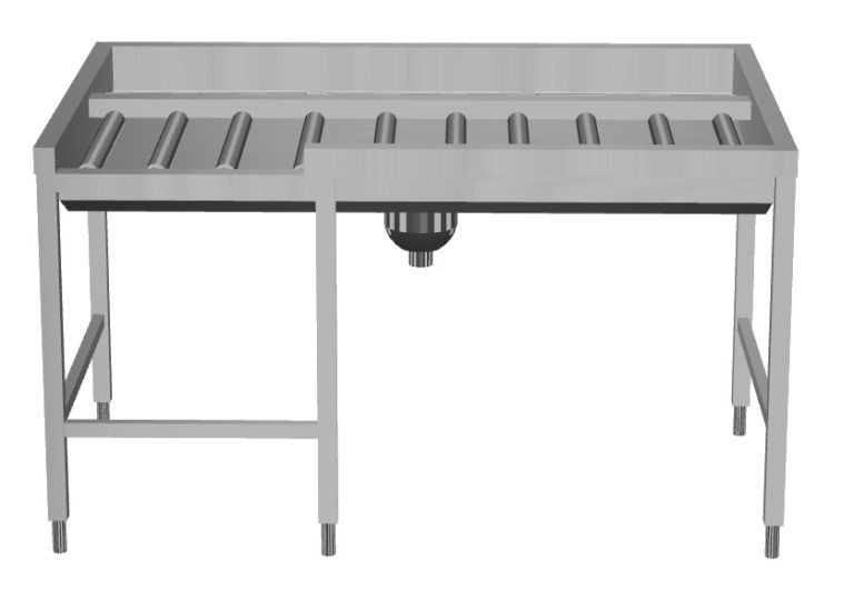 - Il tavolo di sbarazzo manuale con caricatore frontale può essere collegato direttamente alla lavastoviglie a cesto trascinato oppure dopo la rulliera, dopo una curva a 90° azionata da lavastoviglie e dopo un caricatore laterale nella zona di carico.