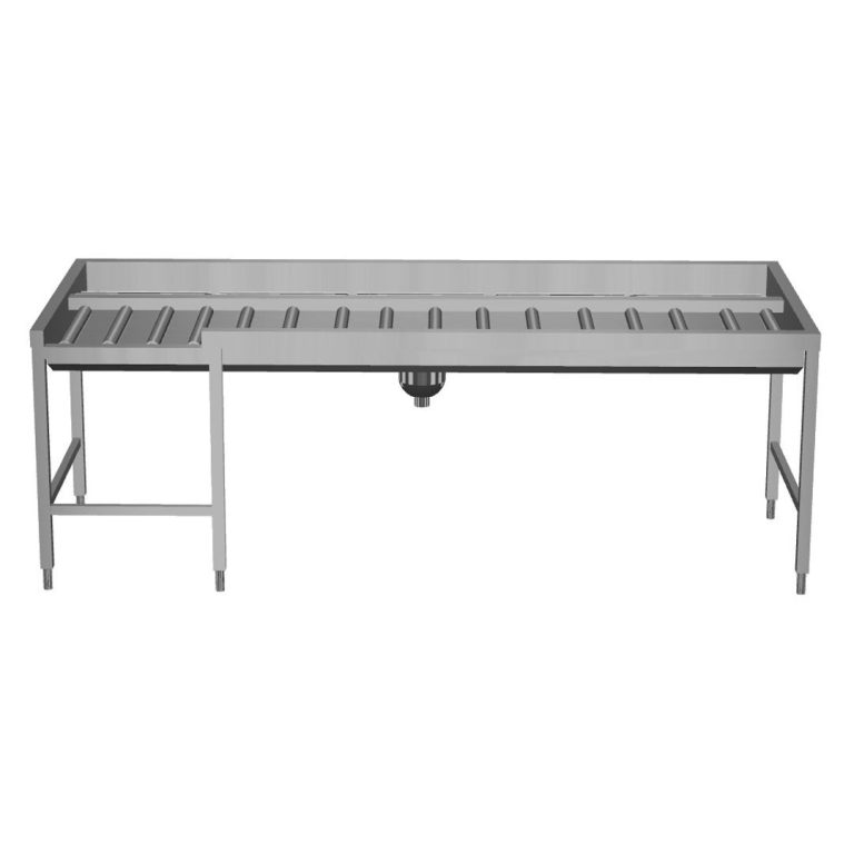 - Il tavolo di sbarazzo manuale con caricatore frontale può essere collegato direttamente alla lavastoviglie a cesto trascinato oppure dopo la rulliera, dopo una curva a 90° azionata da lavastoviglie e dopo un caricatore laterale nella zona di carico.