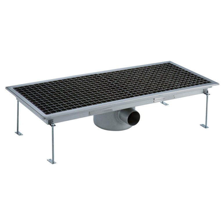 Vasca di raccolta con grigliato, sifone centrale, filtro, scarico orizzontale dia.70 mm, AISI 304