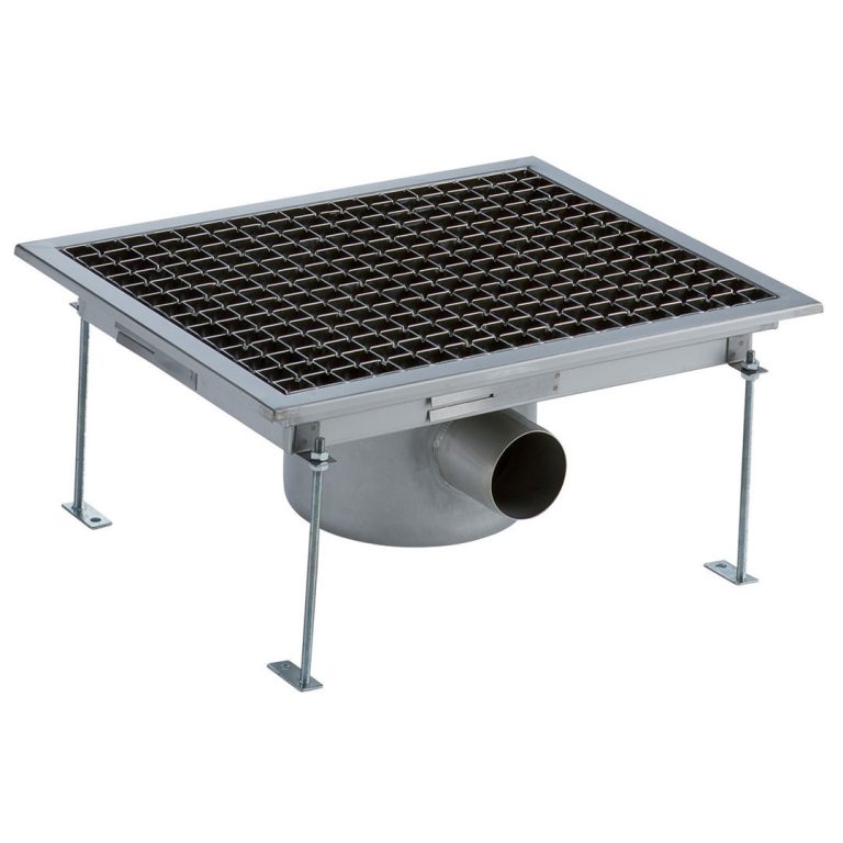 Vasca di raccolta con grigliato, sifone centrale, filtro, scarico orizzontale dia.70 mm, AISI 304