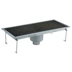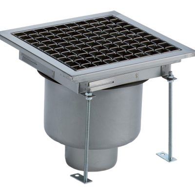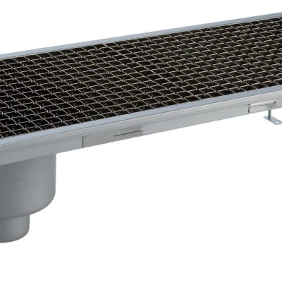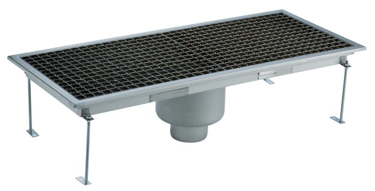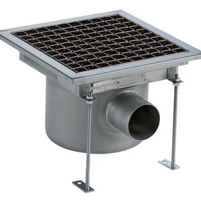 Vasca di raccolta con grigliato, sifone centrale, filtro, scarico verticale dia.100 mm, AISI 304