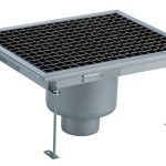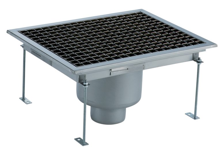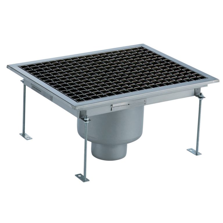 Vasca di raccolta con grigliato, sifone centrale, filtro, scarico verticale dia.100 mm, AISI 304