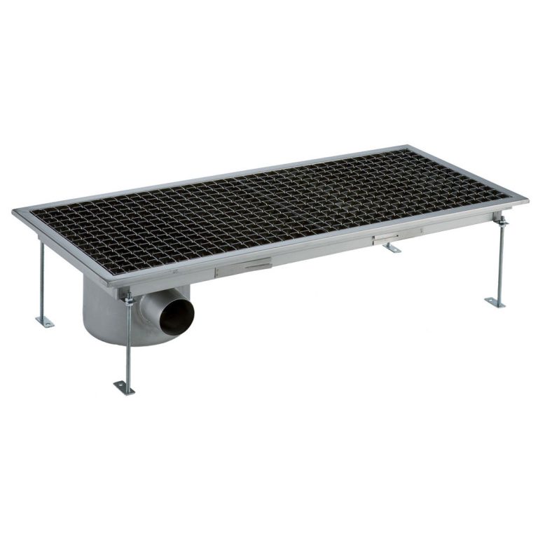 Vasca di raccolta con grigliato, sifone laterale, filtro, scarico orizzontale dia.70 mm, AISI 304