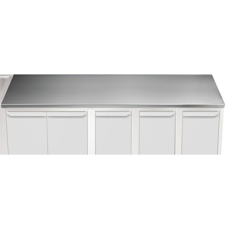 - Piano di lavoro in acciaio inox AISI 304 (CrNi 18/10) di 40 mm di altezza e spessore lamiera di 15/10