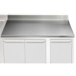 - Alzatina paraspruzzi alta 100 mm con angolatura superiore di 45°. L'alzatina è ricavata direttamente dalla piegatura del piano di lavoro ed ha gli angoli laterali completamente saldati per evitare lo sgocciolamento dell'acqua.