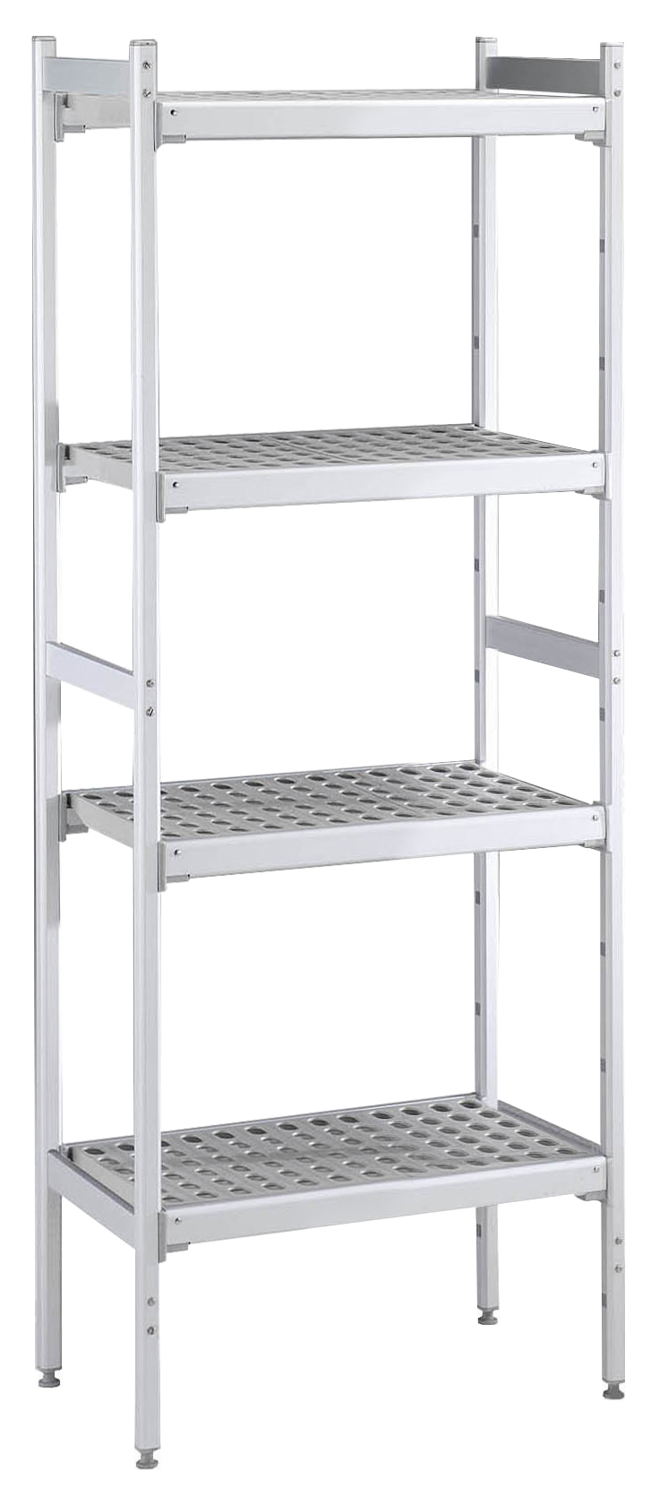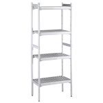 Set scaffali lineari, montanti laterali in alluminio e 4 ripiani forati in polietilene, dim.373x1126 mm