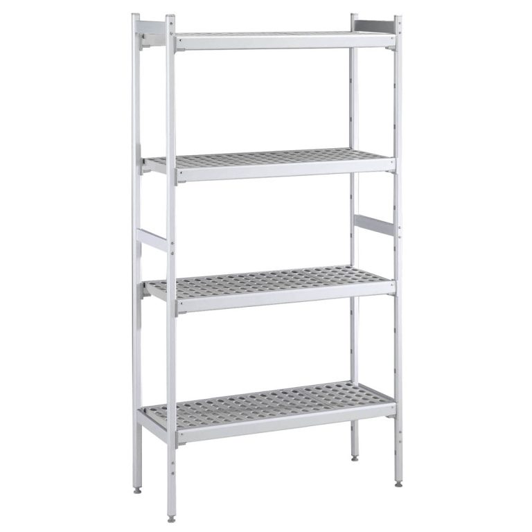 Set scaffali lineari, montanti laterali in alluminio e 4 ripiani forati in polietilene, dim.373x1569 mm