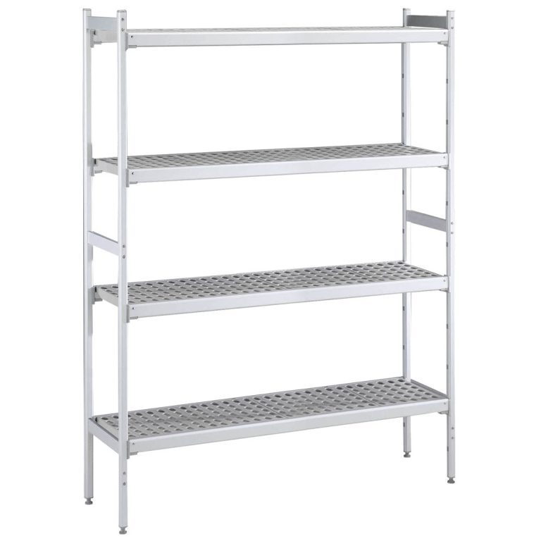 Set scaffali lineari, montanti laterali in alluminio e 4 ripiani forati in polietilene, dim.373x2224 mm
