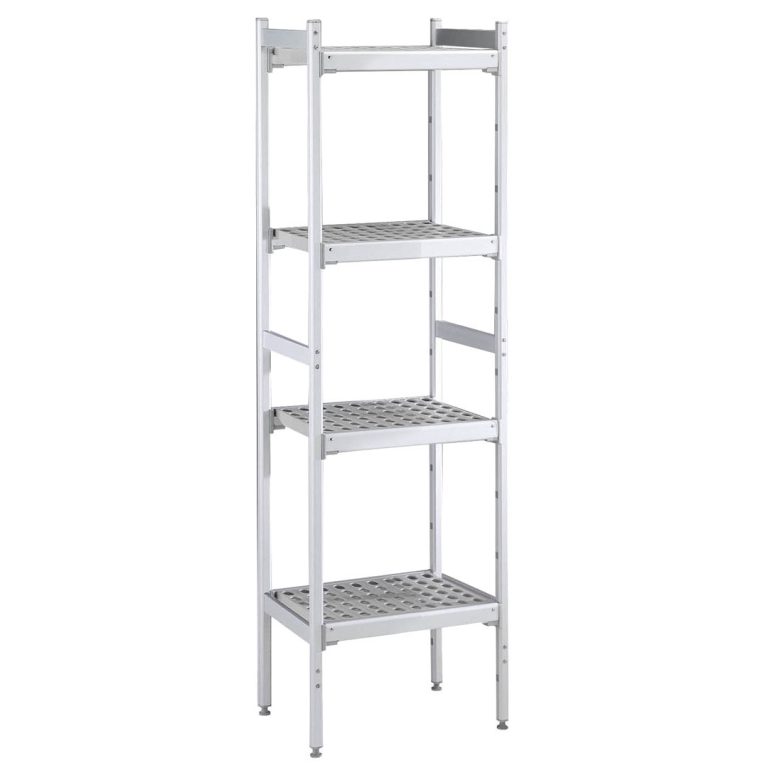 Set scaffali lineari, montanti laterali in alluminio e 4 ripiani forati in polietilene, dim.373x862 mm