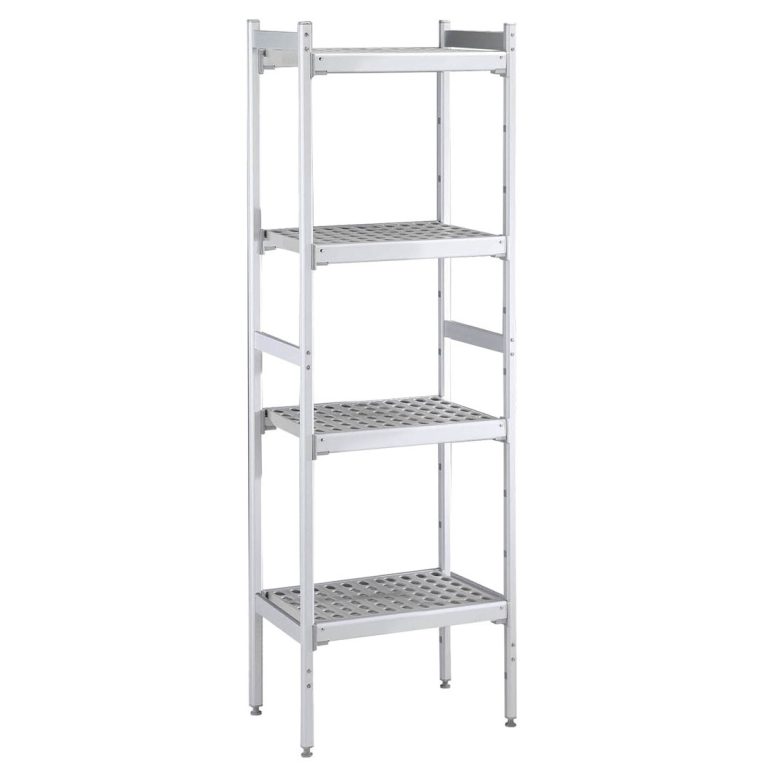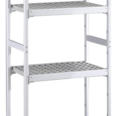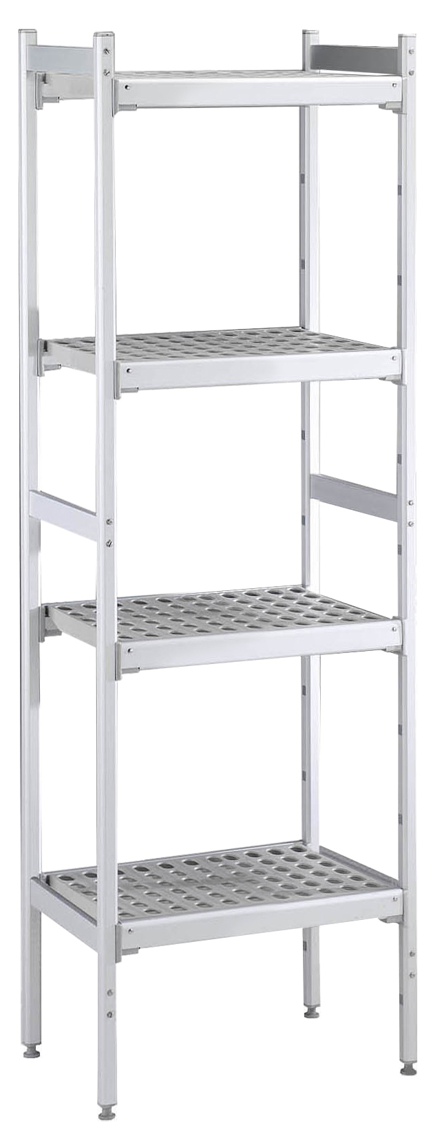Set scaffali lineari, montanti laterali in alluminio e 4 ripiani forati in polietilene, dim.373x950 mm