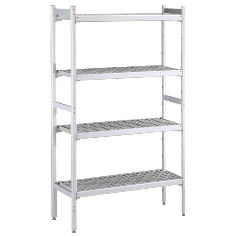 Set scaffali lineari, montanti laterali in alluminio e 4 ripiani forati in polietilene, dim.475x1696 mm