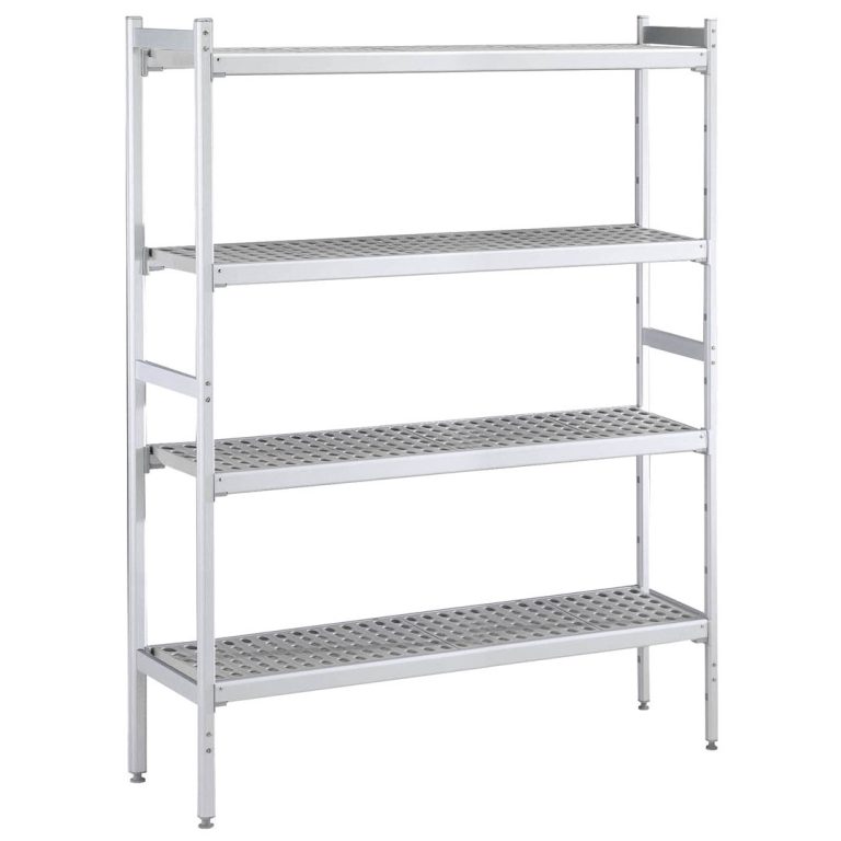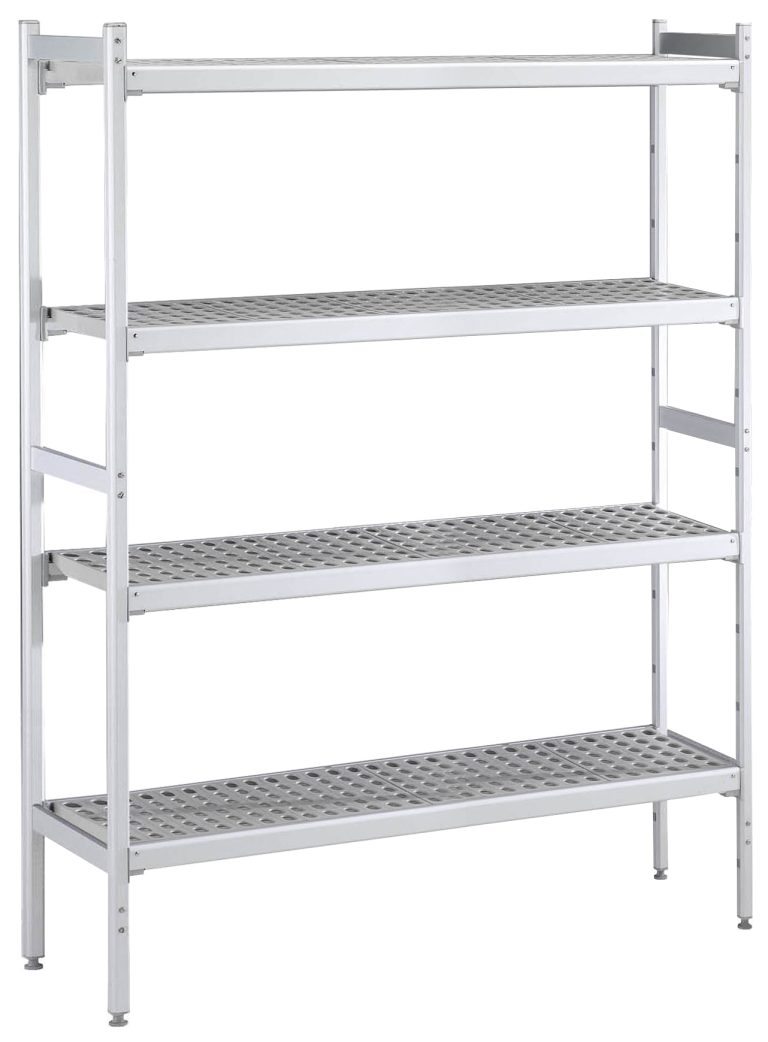 Set scaffali lineari, montanti laterali in alluminio e 4 ripiani forati in polietilene, dim.475x2224 mm