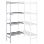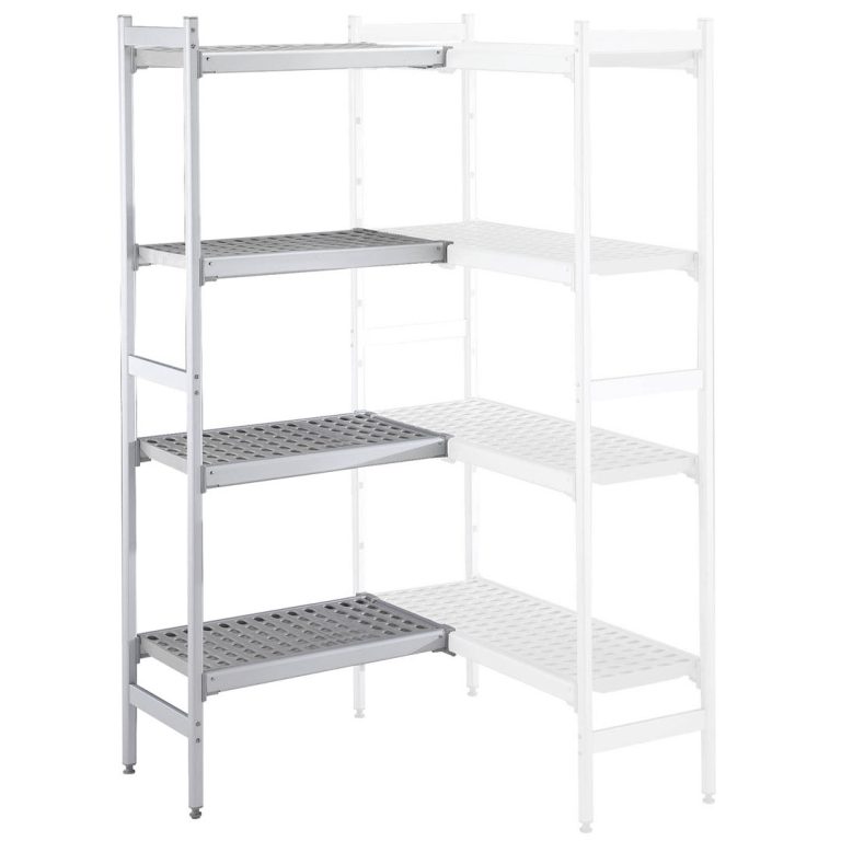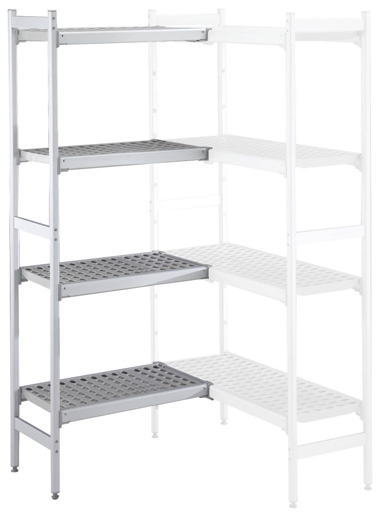 Set scaffali angolari, montanti laterali in alluminio e 4 ripiani forati in polietilene, dim.373x1098 mm