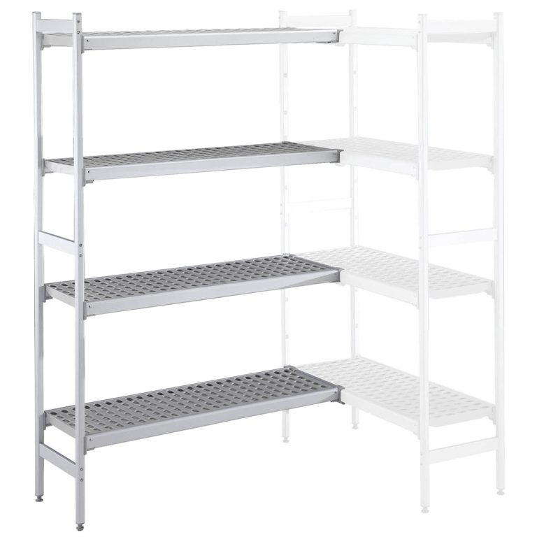 Set scaffali angolari, montanti laterali in alluminio e 4 ripiani forati in polietilene, dim.373x1844 mm