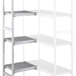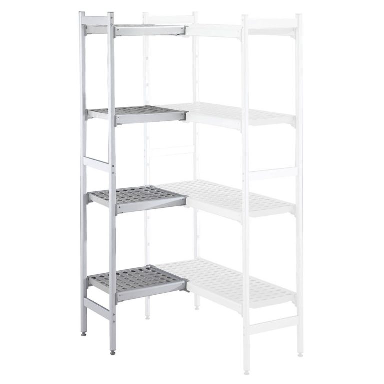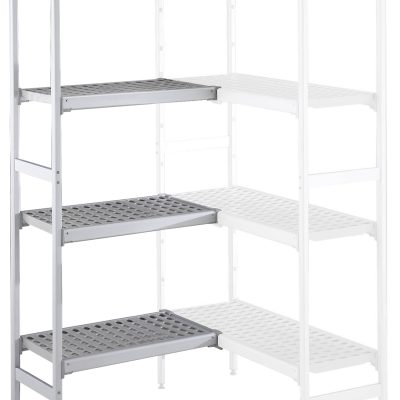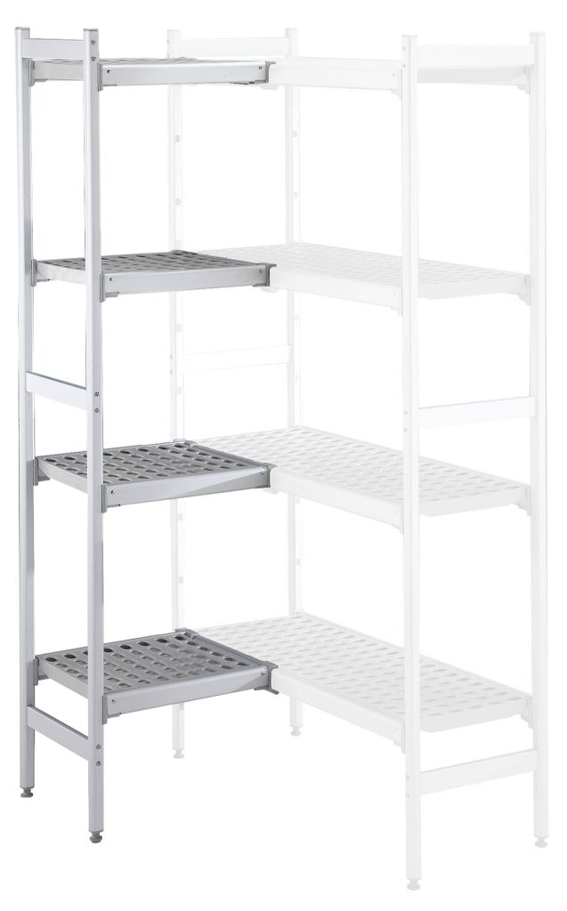 Set scaffali angolari, montanti laterali in alluminio e 4 ripiani forati in polietilene, dim.373x744 mm