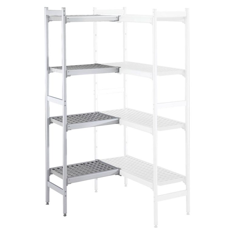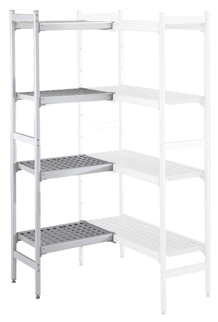 Set scaffali angolari, montanti laterali in alluminio e 4 ripiani forati in polietilene, dim.373x922 mm