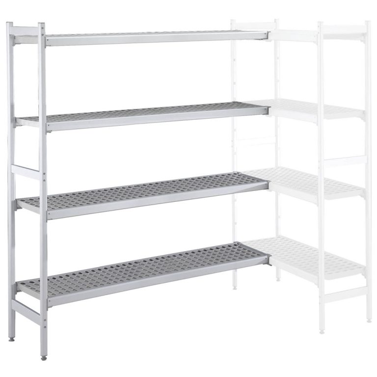 Set scaffali angolari, montanti laterali in alluminio e 4 ripiani forati in polietilene, dim.475x2547 mm