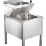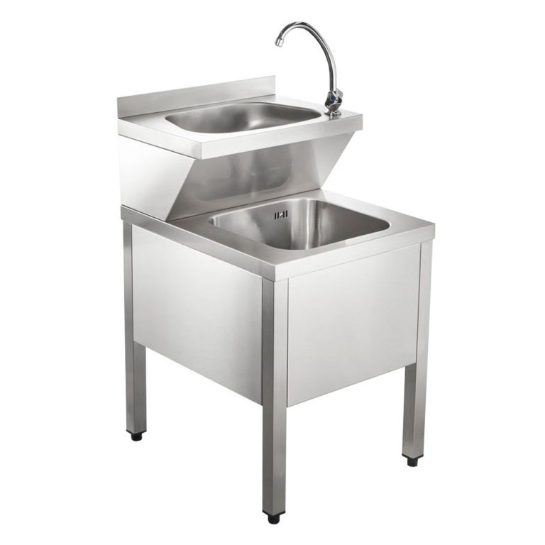 Lavamani su gambe con vasca superiore (340x240xh150 mm) e vasca inferiore (340x340xh160 mm) dotate di rubinetti, foro di scarico e griglia di supporto