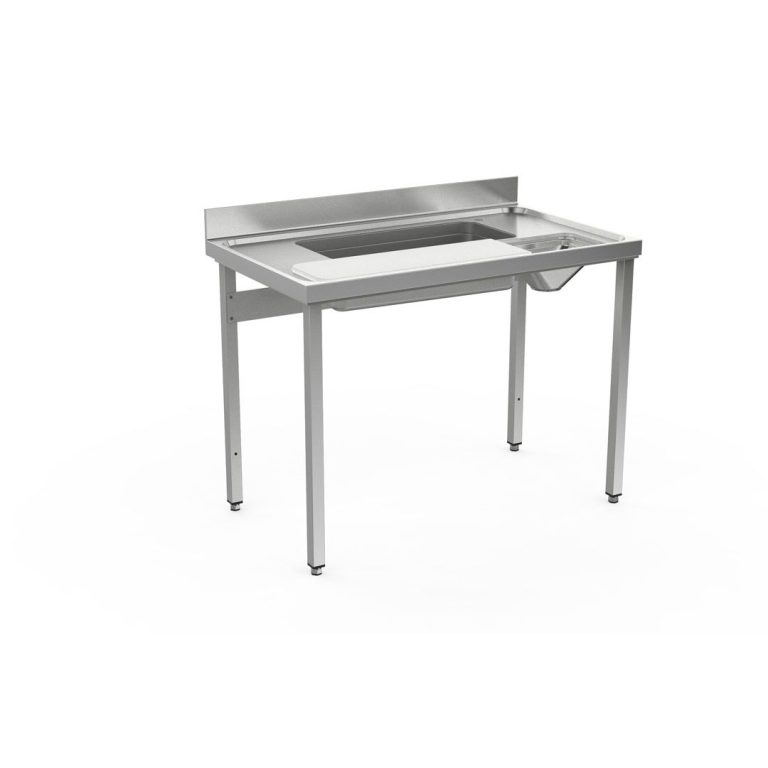 - Il piano ha un invaso ribassato di 20 mm, con fondo inclinato e foro di scarico, sul quale si incastrano due ripiani forati, estraibili per la pulizia, un tagliere in plietilene, una bacinella GN per contenimento licquidi facilmente removibile e un contenitore per coltelli. Lo sterilizzatore coltelli può essere fornito come optional.